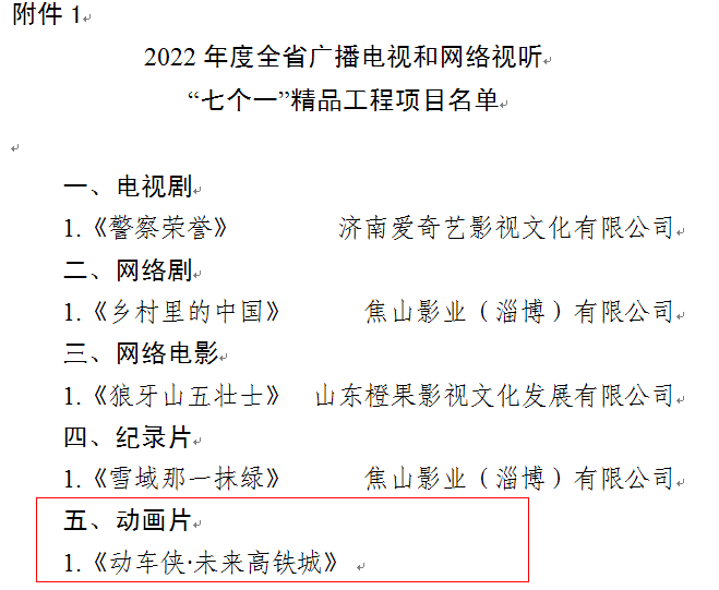 为反映时代新气象、讴歌人民新创造,山东省出台了《文旅产业2022年行动计划》,实施一部电视剧、一部网络剧、一部网络电影、一部动画片、一部纪录片、一个广播剧、一批公益广告等“七个一”精品工程。