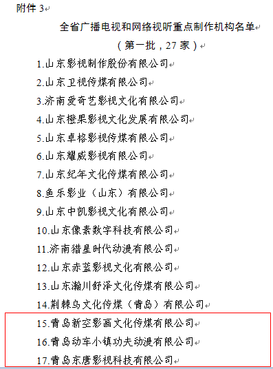 近日,城阳区出品的《动车侠·未来高铁城》入选山东省唯一一部精品动画片工程项目;区内三家影视企业——青岛新空影画文化传媒有限公司、青岛动车小镇功夫动漫有限公司、青岛东唐影视科技有限公司入选山东省广播电视和网络视听重点制作机构,入选企业总量居全市第一、全省第二。