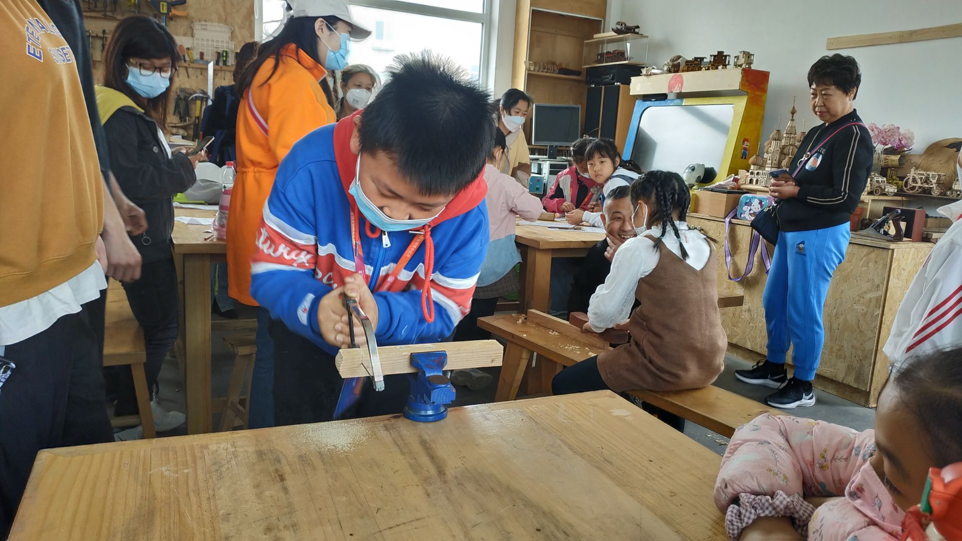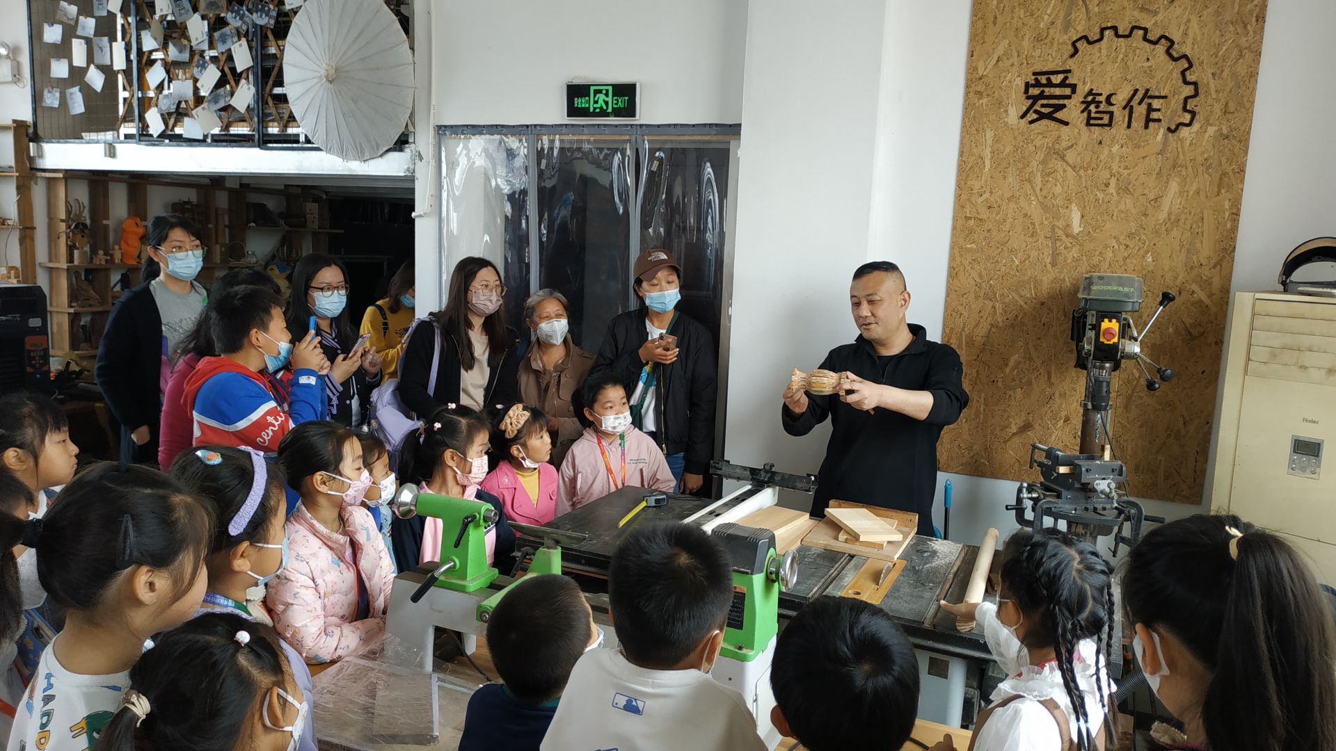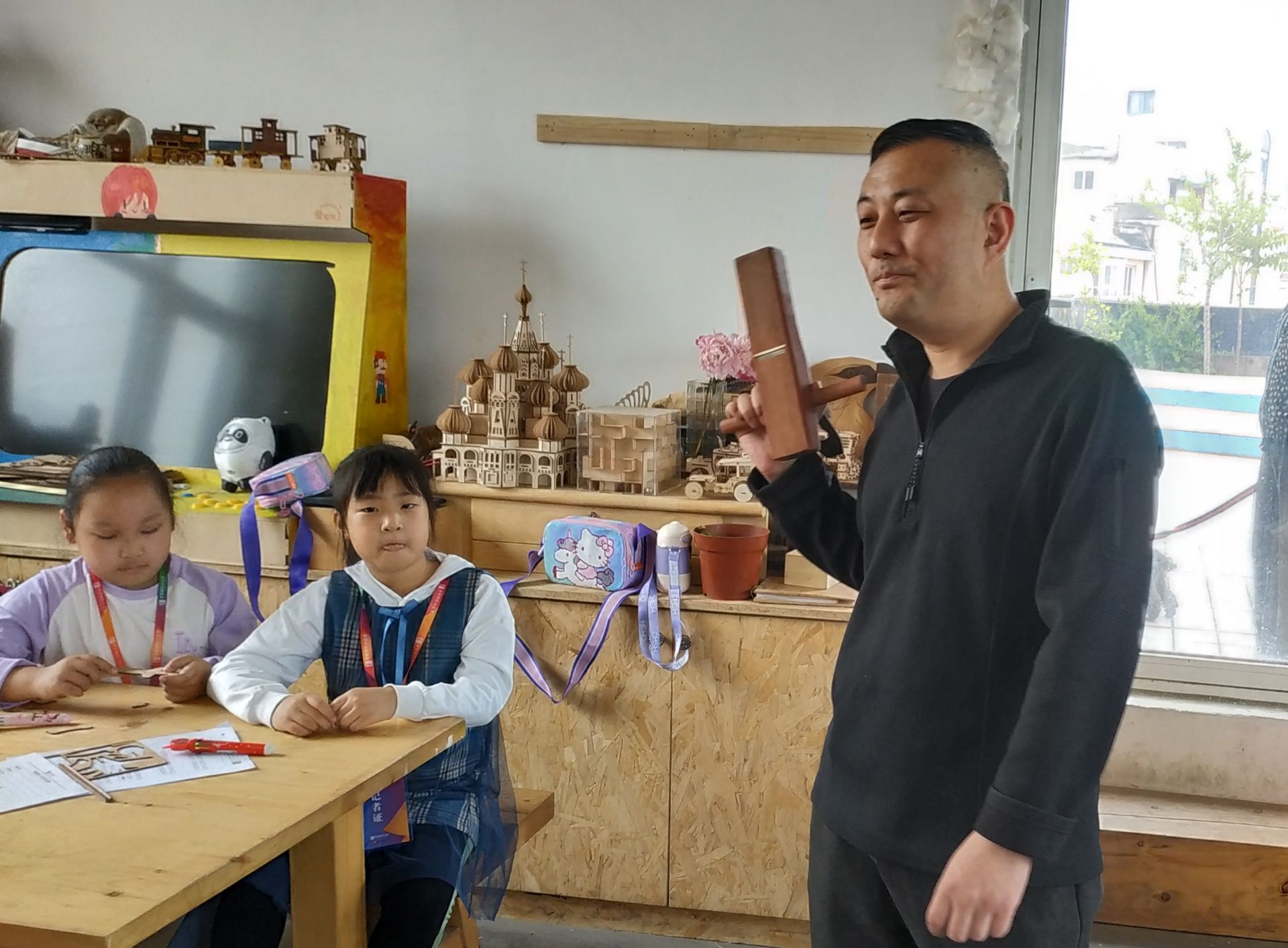 爱智作匠创空间是“由木头组成的空间”,小到摆件、工具、木头制作而成的城堡、马车,大到工作台、桌子、游戏机,几乎所有的木制品都是由老师们亲手打造而成。