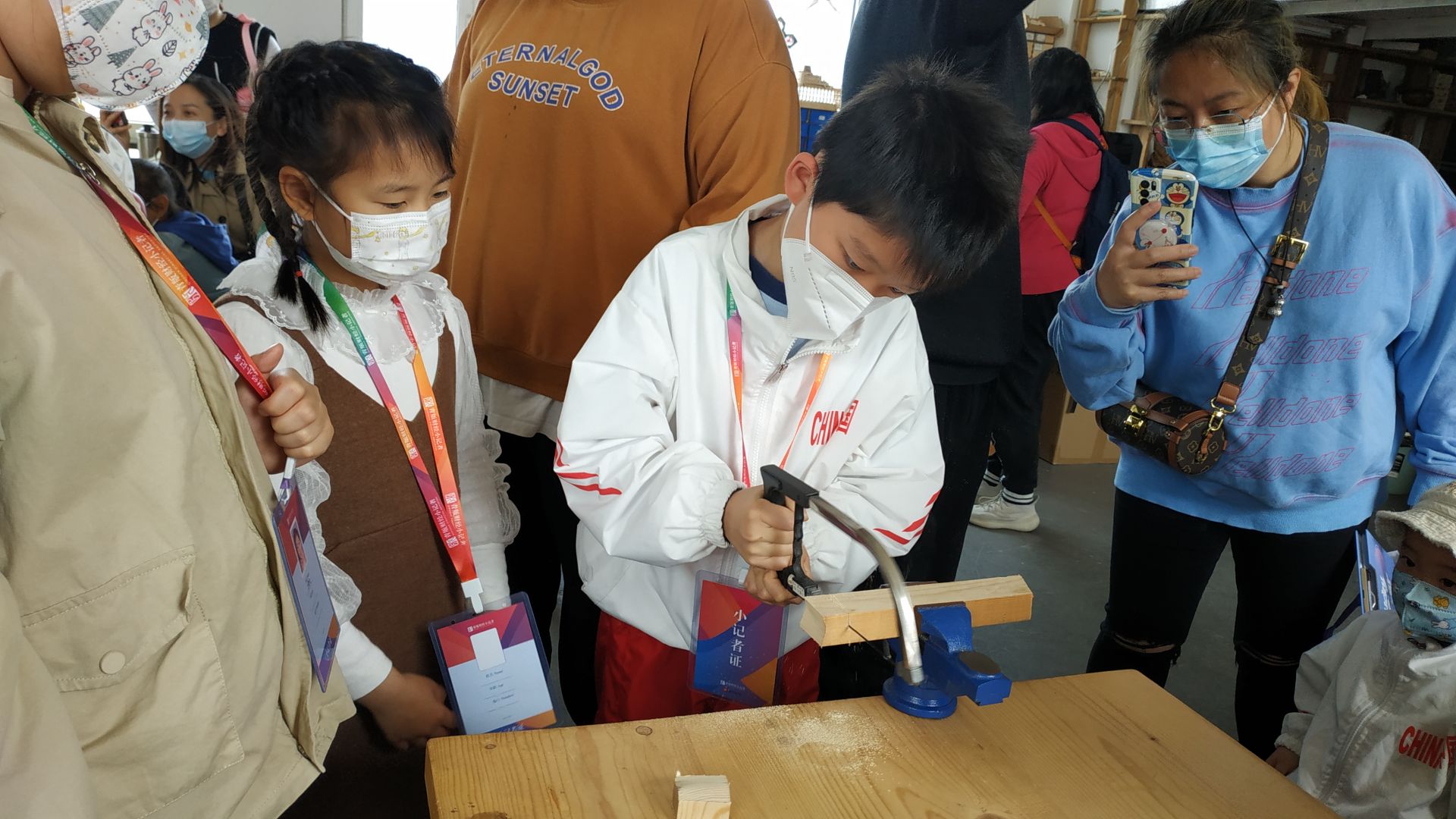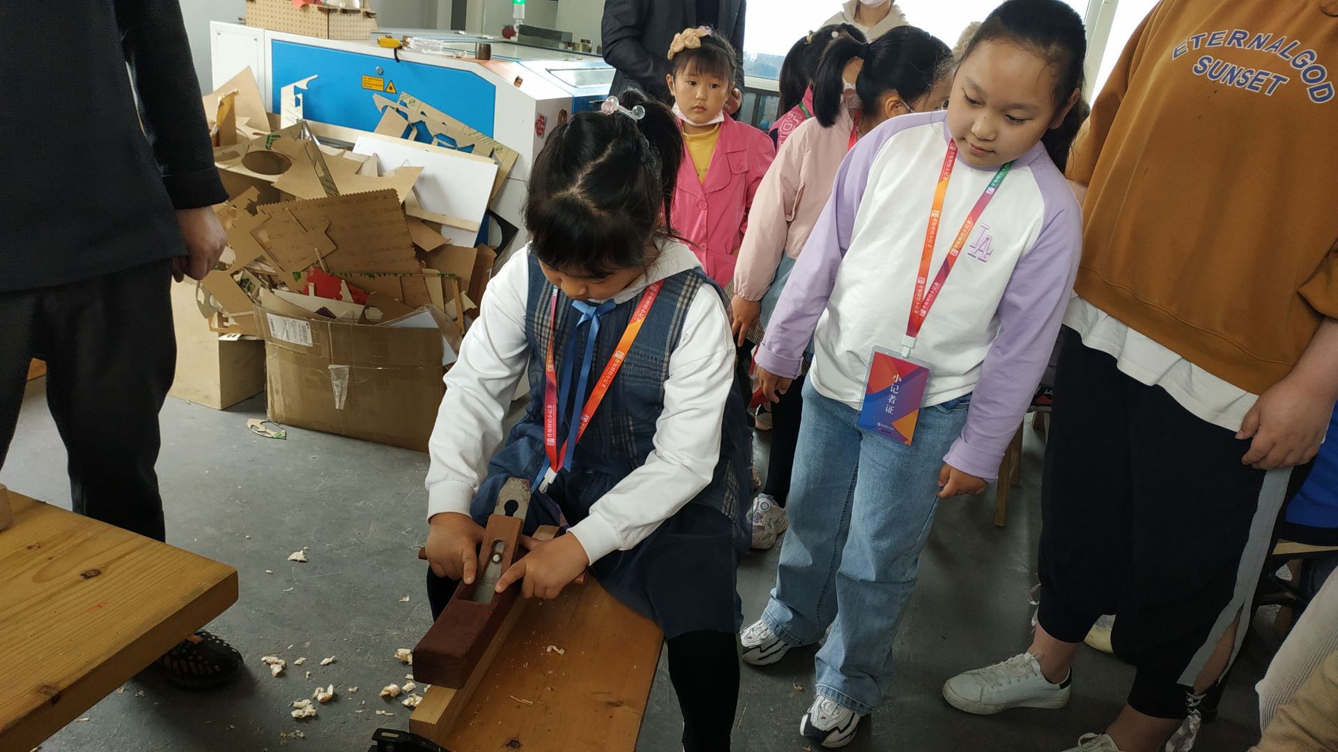 随后,小记者分为几人一组,体验了木工中的刨削和锯切。刨削加工是用刨刀对木条进行水平直线“往复运动”,要特别掌握好用力的角度。锯切是用手锯对木条进行分割,木条要夹紧,并应防止在锯切中抖动。在几位老师的帮助下,小记者们慢慢熟悉了工具的特性,使用方法。