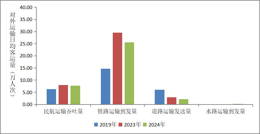对外交通运输总量299.00万人次,日均42.71万人次,同比增长5.88%,较2019年增长46.33%。其中:民航运输吞吐量61.41万人次,日均8.77万人次,同比增长11.09%,较2019年增长15.89%;铁路运输到发量222.52万人次,日均31.79万人次,同比增长7.75%,较2019年增长92.19%;道路运输发送量14.96万人次,日均2.14万人次,同比降低27.01%,较2019年降低57.93%;水路运输(国际客运)发送量0.11万人次,日均0.02万人次,同比增长10.00%。