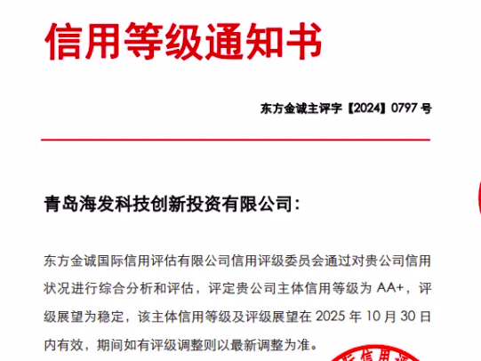 近日,青岛国信集团一级子公司青岛国信产融控股(集团)有限公司获得国内权威评级机构东方金诚国际信用评估有限公司给予的 AAA 级主体信用评级,评级展望为稳定。青岛国信集团成为母、子公司同时具备AAA级主体信用评级的国有企业。