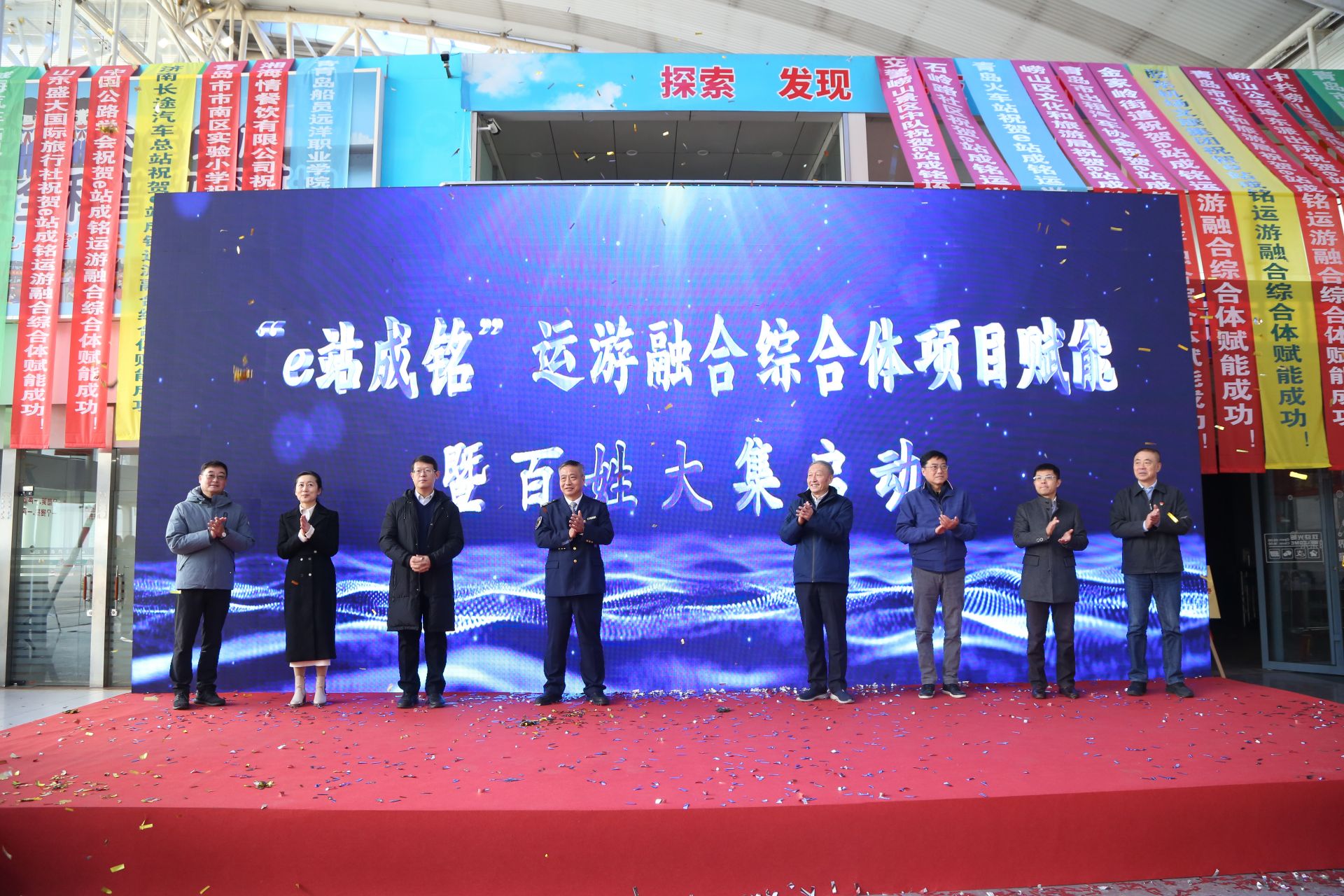 “赶个年味大集”的龙门格外引人注目,舞狮表演点燃了新年的气氛。穿过灯笼长廊,广场中央的红色六角仿古二层楼吸引众人目光。