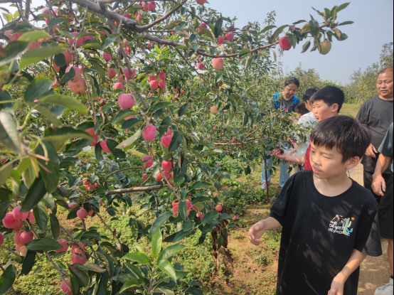 随后,小记者们满怀期待地走进果蔬种植家庭农场,开启了香甜的鸡心果采摘之旅。一进果园,眼前的景象便让大家眼前一亮:成片的鸡心果树整齐排列,枝叶繁茂葱郁,一串串形似鸡心的果实挂满枝头,青中透红的果皮泛着细腻光泽,宛如一个个精致的“迷你红灯笼”,在绿叶掩映下格外诱人。
