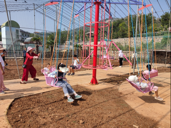 这里还有一片专为孩子们打造的欢乐天地。小记者们有的坐上滑道垫,双手紧抓两侧扶手,伴随着“咻”的一声尖叫滑向坡底,脸上满是兴奋;有的钻进“千山万水”攀爬网,手脚并用向前攀登……